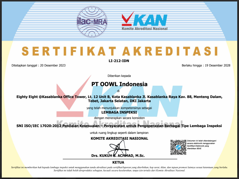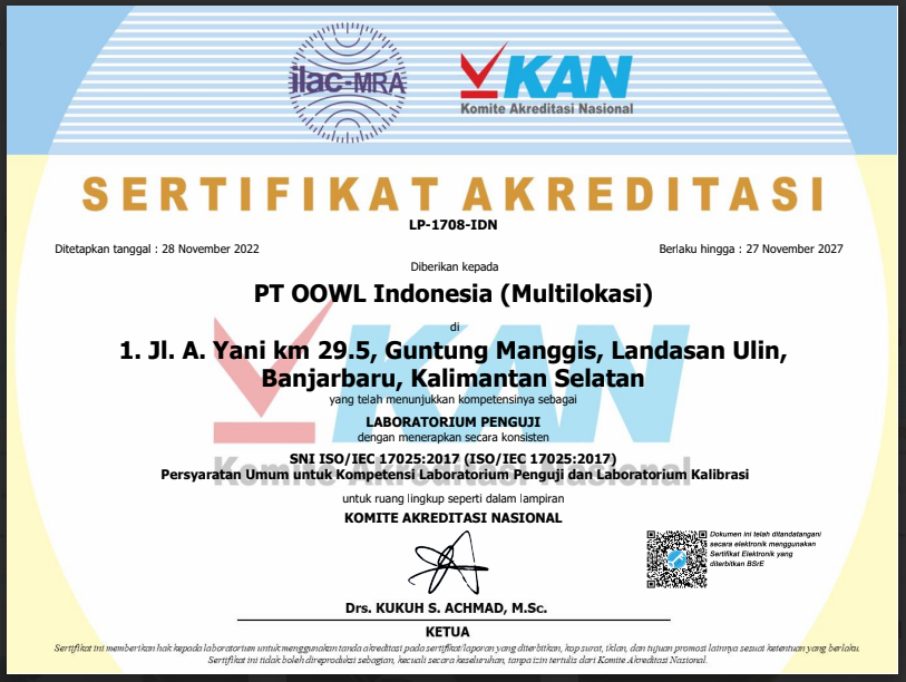 Consistently, PT. OOWL Indonesia implements a Laboratory Management System Testing and Inspection Agency based on SNI ISO/IEC 17025: 2017 dan SNI ISO/IEC 17020 :2012 in several branches.